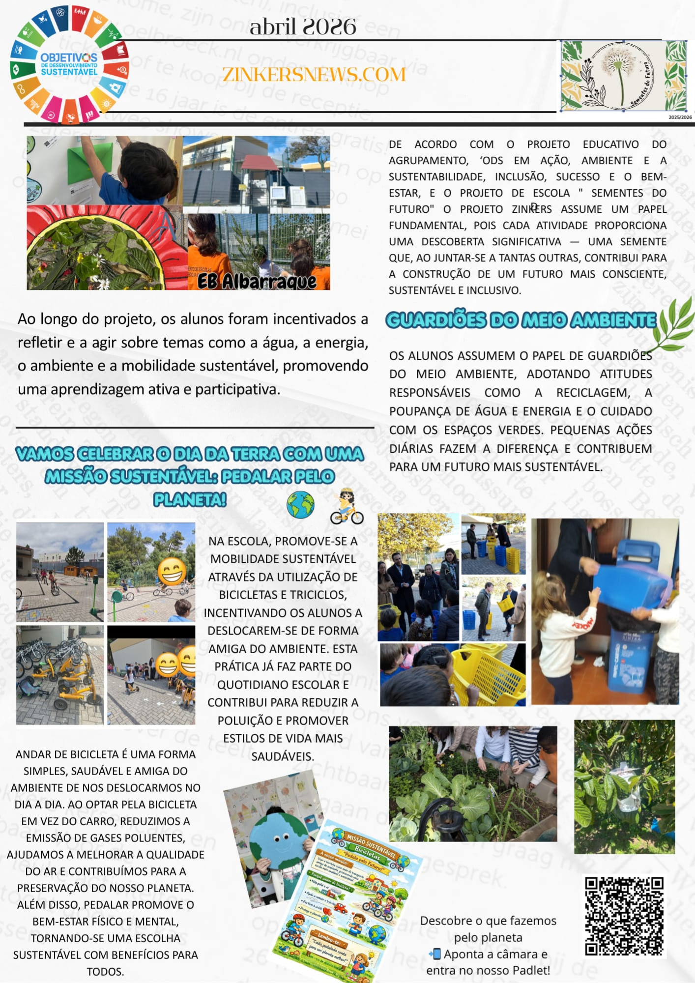 Os alunos do 1.º ciclo da EB Albarraque, em Sintra, encontram-se a desenvolver o Projeto Zinkers, uma iniciativa da Fundação Repsol que promove a educação para a sustentabilidade através de uma abordagem simples, prática e motivadora. Este projeto surge alinhado com as prioridades educativas atuais, reforçando a formação de cidadãos mais conscientes, responsáveis e interventivos.