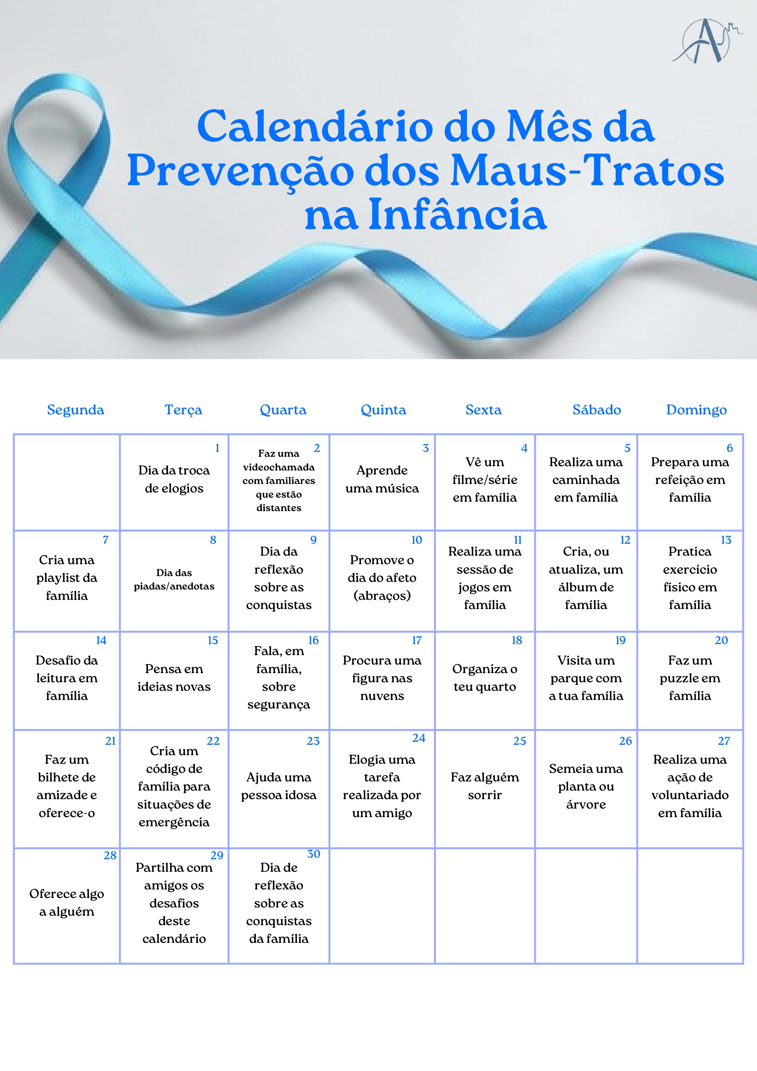 No âmbito do Mês de Prevenção dos Maus-Tratos na Infância, apresentamos o calendário por nós desenvolvido, com diversas atividades que poderão ser dinamizadas em família.