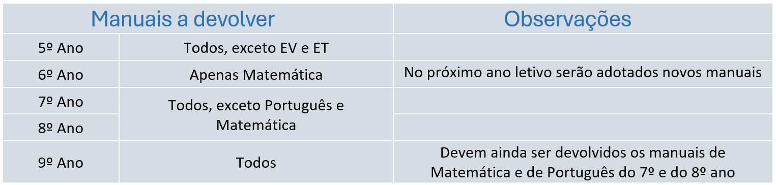 9.ºAno – Os alunos que se encontram na situação de NÃO APROVADO (incluindo os que estão inscritos nas provas de equivalência à frequência) não entregam os manuais.