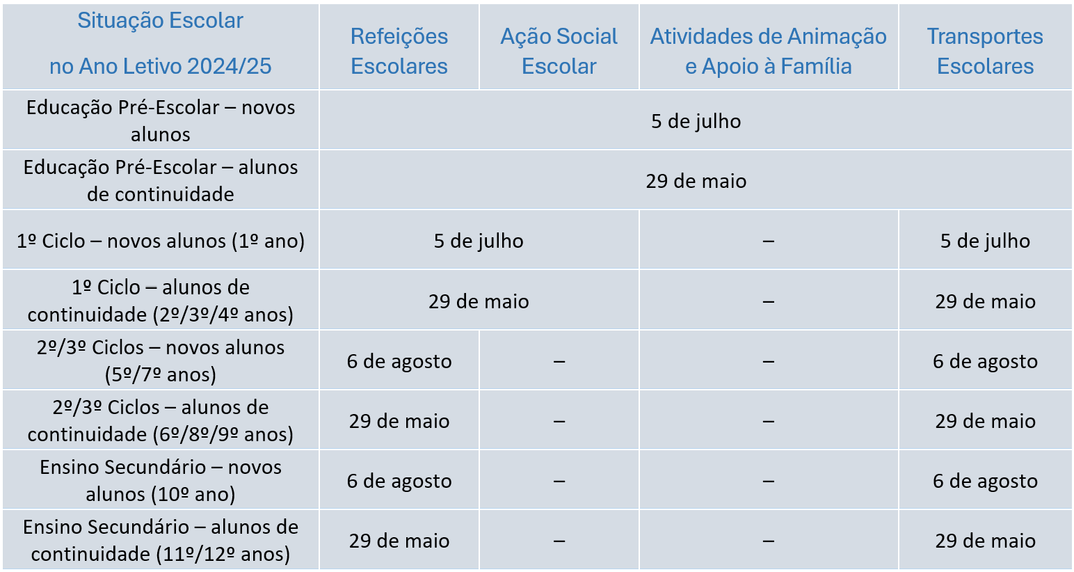 Datas a partir das quais poderão os senhores encarregados de educação candidatar os seus educandos às várias respostas: