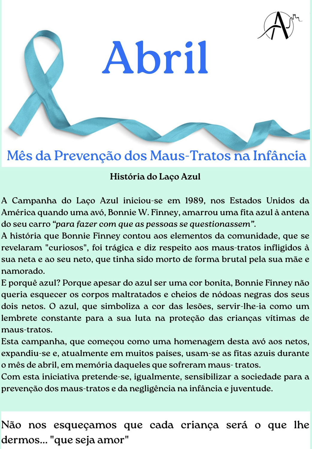 O nosso Agrupamento associa-se à campanha do Laço Azul, reforçando que todas as crianças merecem crescer num espaço onde se sintam protegidas, valorizadas e amadas.